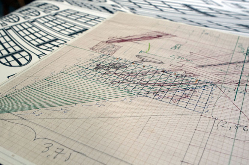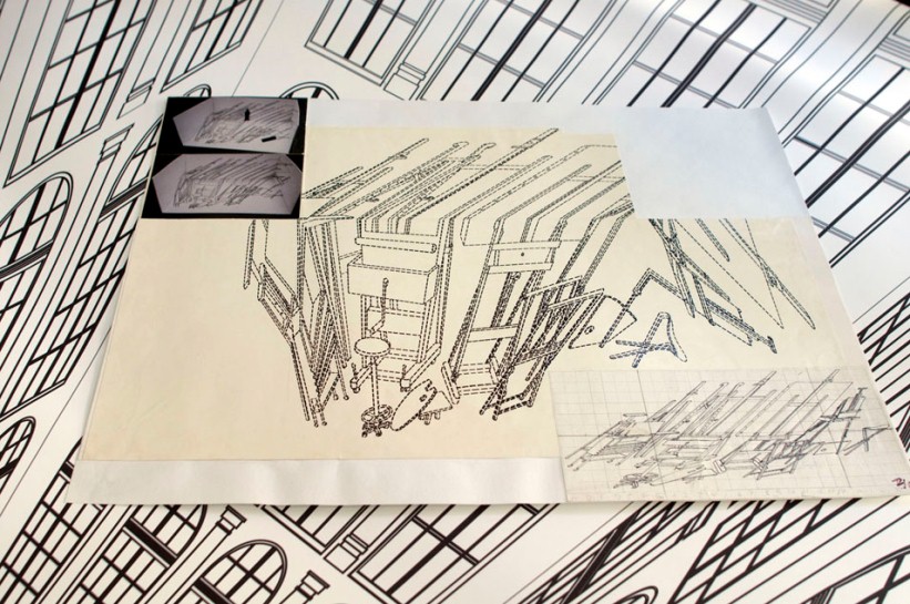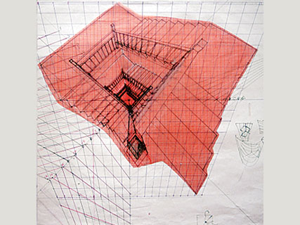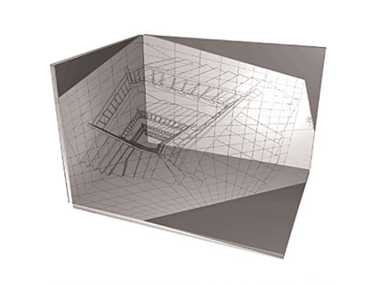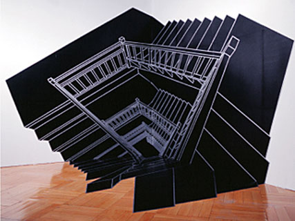 Tive, então, contato com os estudos que deram origem ao trabalho de 1999. A foto da escadaria no centro do papel, os traços que se encontravam em diversos pontos de fuga, a dinâmica de suas posições relativas, a projeção da imagem nos três planos a partir de um ponto de vista preestabelecido, enfim, todas as etapas constituíam um processo único de recriação matemática de perspectiva. Obviamente, aquela não era a perspectiva que eu já conhecia de ambientes virtuais em 3D, ela mesma uma simplificação matemática das propriedades de projeção da luz. Tratava-se de uma perspectiva nova, com regras igualmente precisas, suficientemente familiar para que a imagem final fosse compreendida, mas diferente a ponto de estimular novos olhares para objetos conhecidos.
