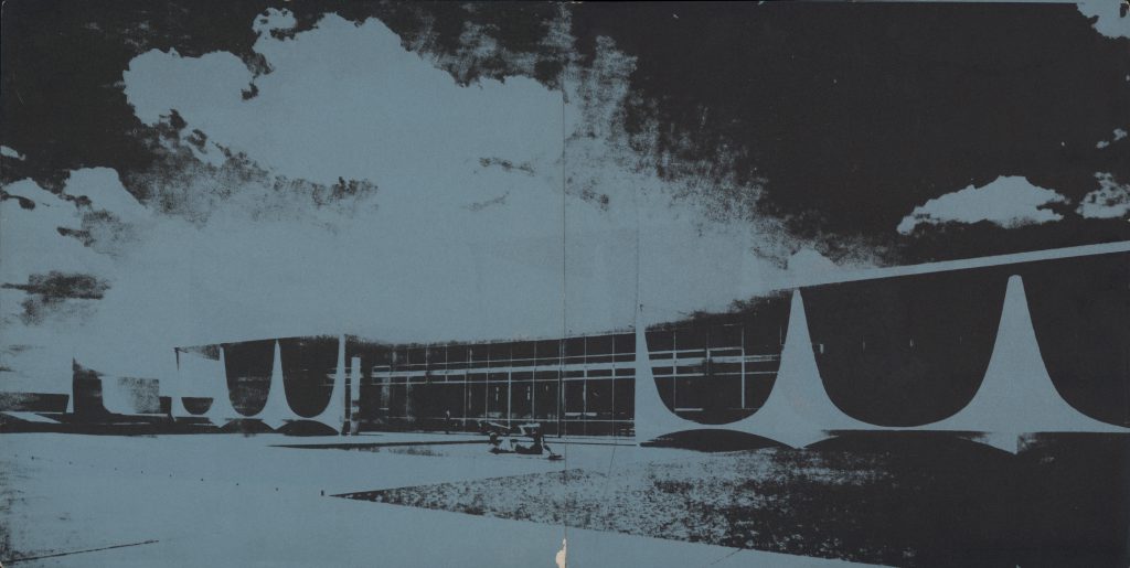 “Agora, em Doorway to Brasilia, tínhamos um livro completamente livre. (…). Vamos usar esse evento, dissemos, o fato de uma nova capital estar sendo construída, para vermos o que podemos tirar de lá e utilizar na tecnologia de impressão”, escreveu Aloisio Magalhães, em 1977, sobre o processo de criação deste livro ao lado do designer Eugene Feldman (1921-1975). Em Doorway to Brasilia, as imagens fotográficas originais foram trabalhadas graficamente no limite do seu reconhecimento, proporcionando, a um só tempo, a visão da capital em construção e a percepção de novas formas de representação gráfica.