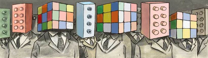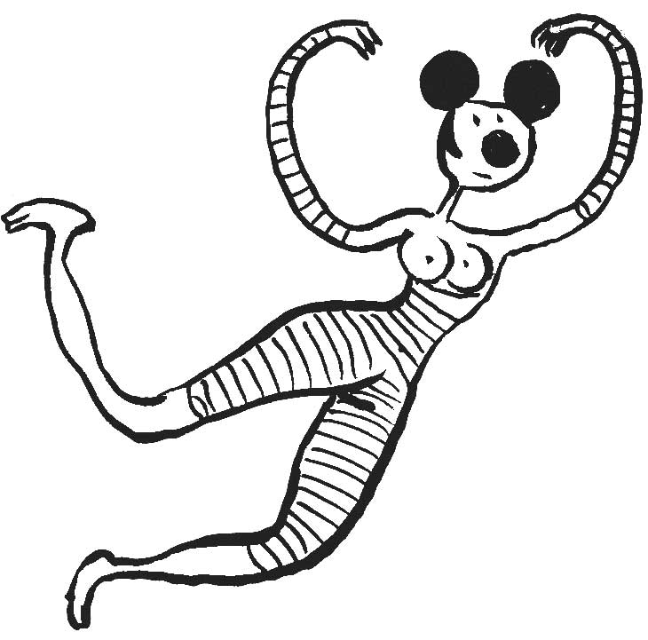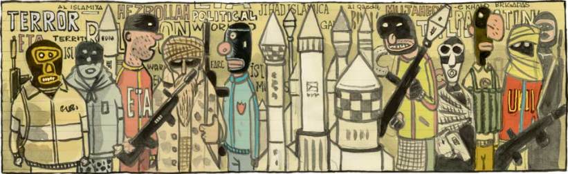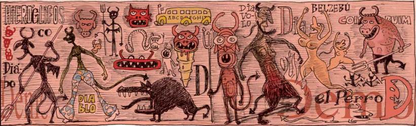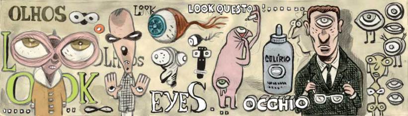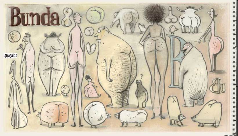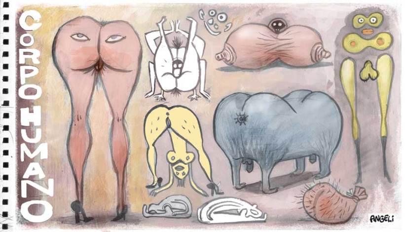 Nestes desenhos, Angeli mistura livremente FORMAS ESTRANHAS e CORES FORTES, criando efeitos plásticos inspirados e, por vezes, perturbadoramente realistas.