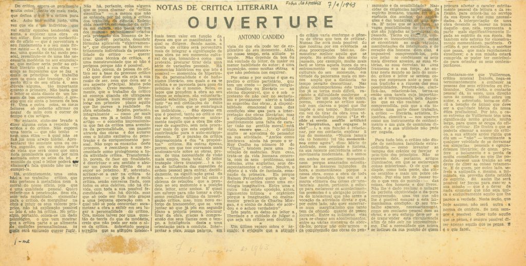 Antonio Candido publicou seu primeiro livro, Brigada Ligeira, em 1945. Na obra, o autor reuniu alguns dos textos que vinha produzindo desde 1943 para a coluna Notas de Crítica Literária, do jornal paulistano Folha da Manhã – foi nesse espaço que o crítico reconheceu o talento de nomes como Clarice Lispector, João Cabral de Melo Neto e João Guimarães Rosa, até então pouco conhecidos.