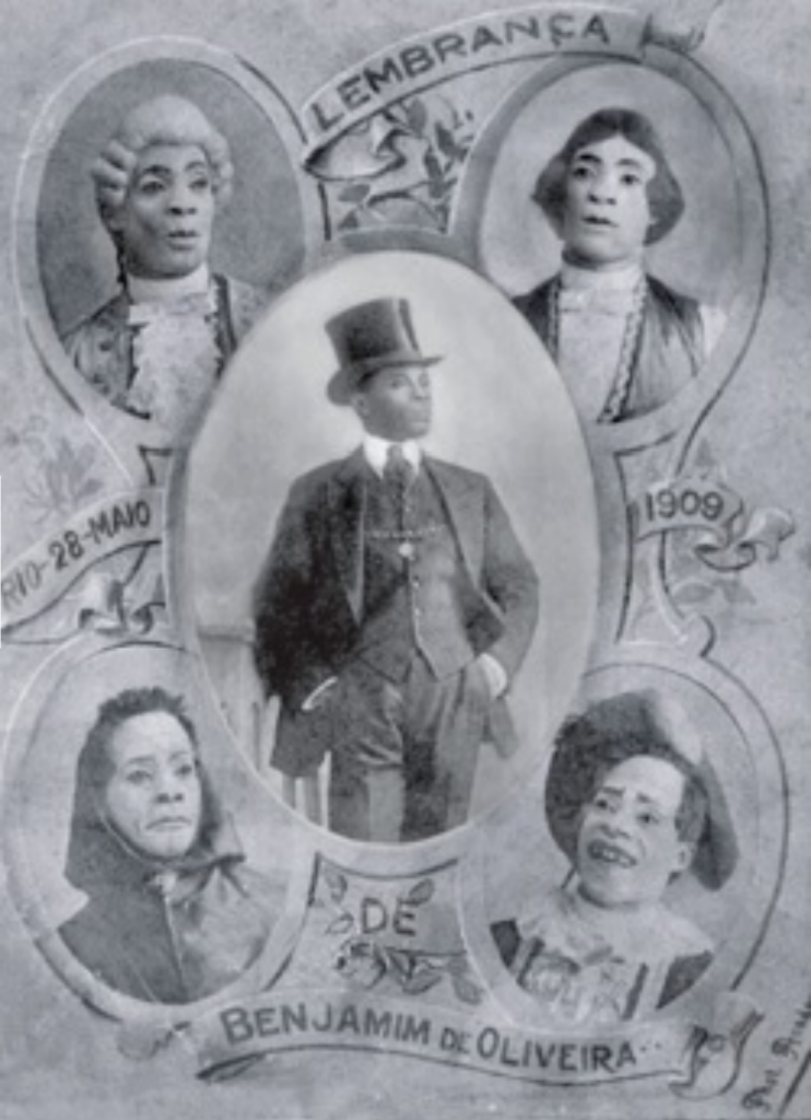 Cartão de divulgação de 1909 com vários personagens encenados por Benjamim de Oliveira no circo-teatro, entre eles o de aristocrata. Talvez a imagem mais conhecida do artista (Fonte: SILVA, Erminia. Circo-teatro: Benjamim de Oliveira e a teatralidade circense no Brasil, 2009, p. 240. Acervos Erminia Silva/Família de Benjamim de Oliveira)