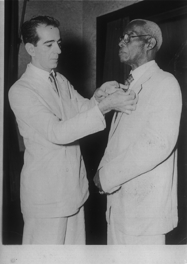 Benjamim de Oliveira sendo condecorado por Floriano Faissal, ator e radialista, com uma medalha durante participação no programa Honra ao mérito, da Rádio Nacional, em 1942. Era comum que as cidades – através de suas autoridades ou de seus representantes de classes, associações artísticas etc. – homenageassem artistas circenses com placas ou medalhas, normalmente de ouro, que eles frequentemente ostentavam em seus coletes e suas casacas (Acervo Família de Benjamim de Oliveira)