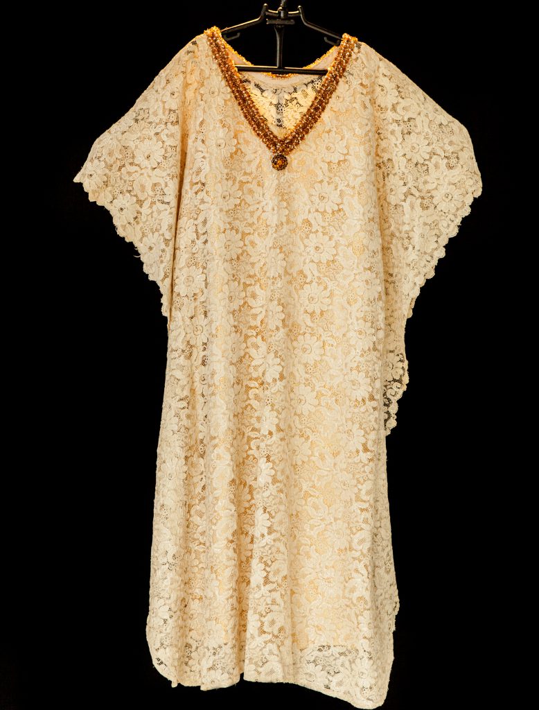 Vestido de Dona Ivone Lara usado nos anos 1980, o segundo mais antigo da carreira ainda preservado – o enfeite dourado foi aplicado pela própria Ivone | imagem: André Seiti