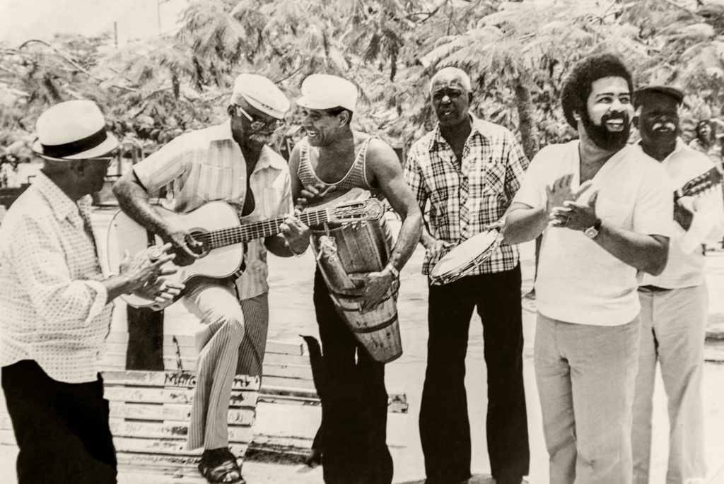 Hélio dos Santos (1903-2007), primo mais velho de Dona Ivone, toca violão ao redor de amigos. Conhecido como Tio Hélio, ele foi parceiro musical de Ivone, com destaque para os sambas “Prazer da Serrinha” e “Cantei Só pra Distrair” | imagem: acervo da família