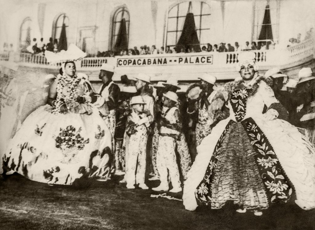 Vestida de baiana, Dona Ivone Lara posa com os dois filhos, Alfredo e Odir, em desfile do Império Serrano nos anos 1950, em frente ao Copacabana Palace | imagem: acervo da família