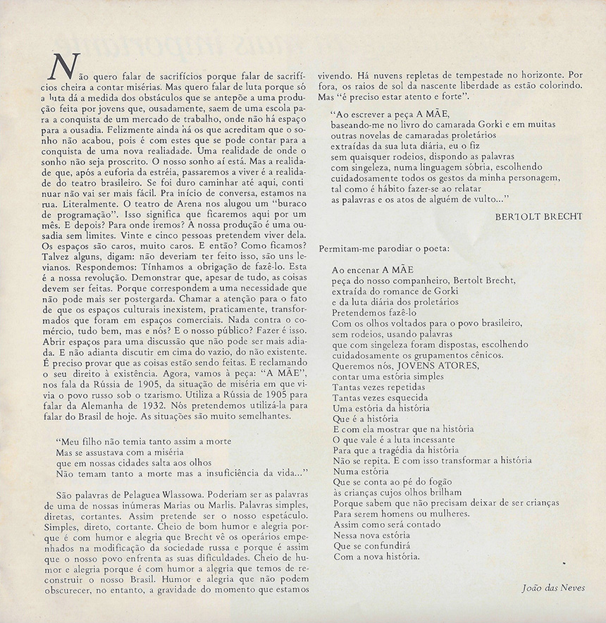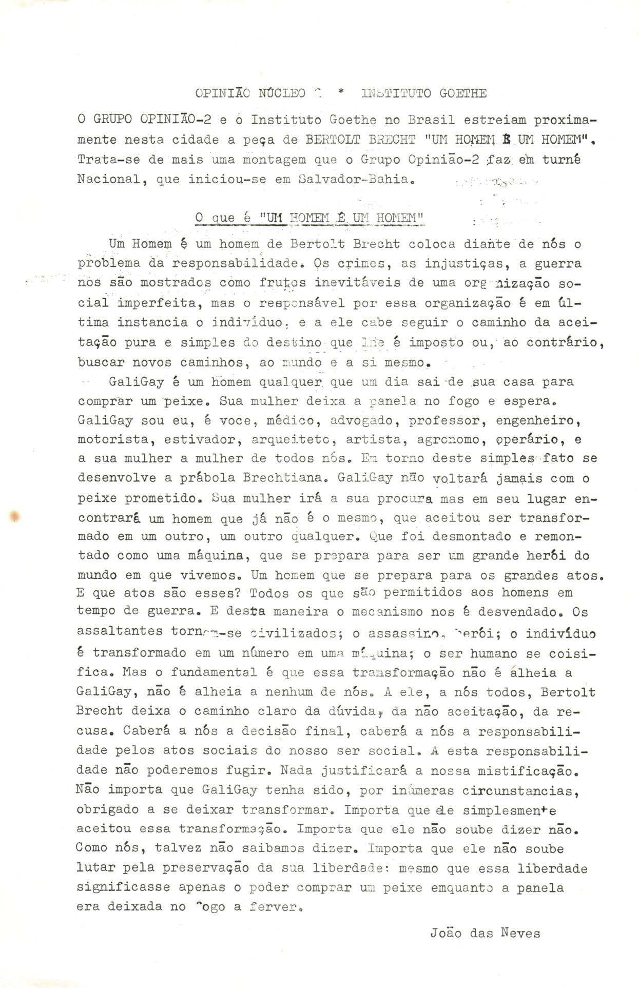 Formado no Rio de Janeiro por artistas de diferentes áreas – todos eles dedicados à conscientização política do povo brasileiro –, o Centro Popular de Cultura (CPC) foi posto na ilegalidade e teve de encerrar suas atividades em 1964, em decorrência do golpe militar. No mesmo ano, uma parcela desses artistas – João das Neves, entre eles – criou aquele que viria a ser o epicentro do teatro de resistência ao regime na capital fluminense: o Grupo Opinião.