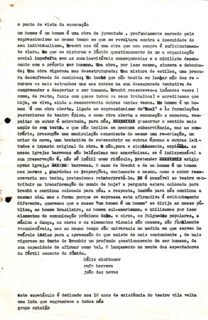 A peça, publicada pela Global Editora em 1978, figura entre os textos expoentes de nossa dramaturgia na coletiva Feira Brasileira de Opinião, censurada e confiscada pelo regime militar. Segundo sua organizadora, Ruth Escobar, a publicação visava retratar o homem brasileiro “aqui e agora, sobretudo com a preocupação de apontar o perfil dos subúrbios do Brasil, onde este governo revela seu verdadeiro rosto”.