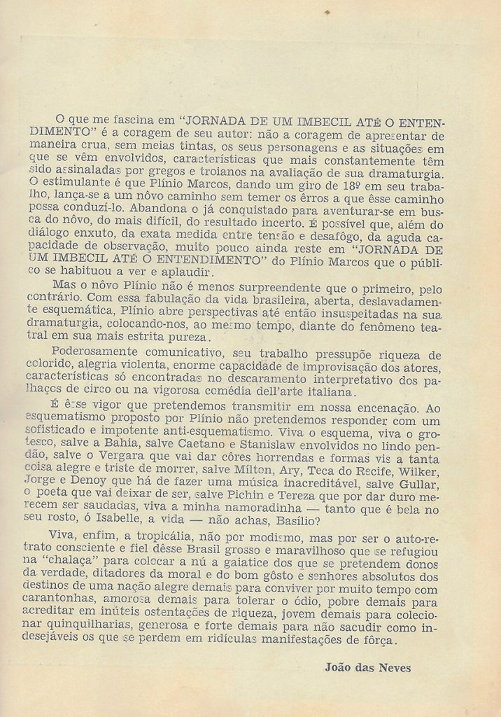 “Coube a João das Neves marcar o gol do início da liberação, ao conseguir levar o povo brasileiro de volta aos nossos palcos em O Último Carro – texto proibido desde 66, que por razões que a própria Censura desconhece, pôde vir à luz em 76.“
