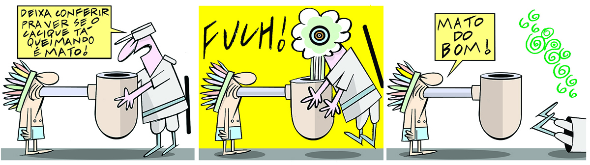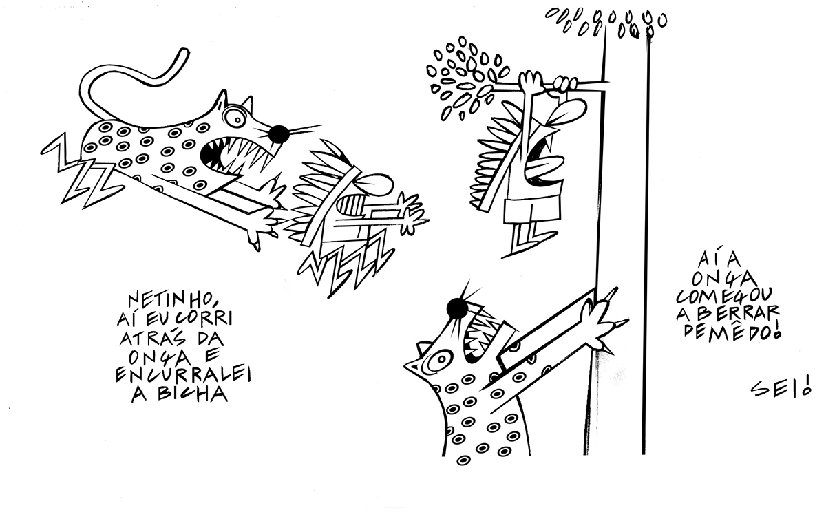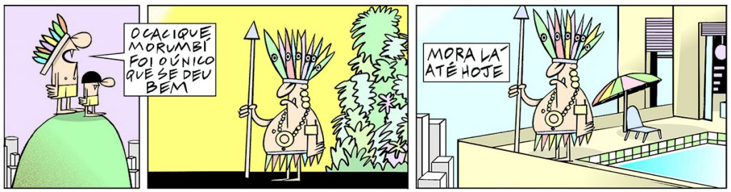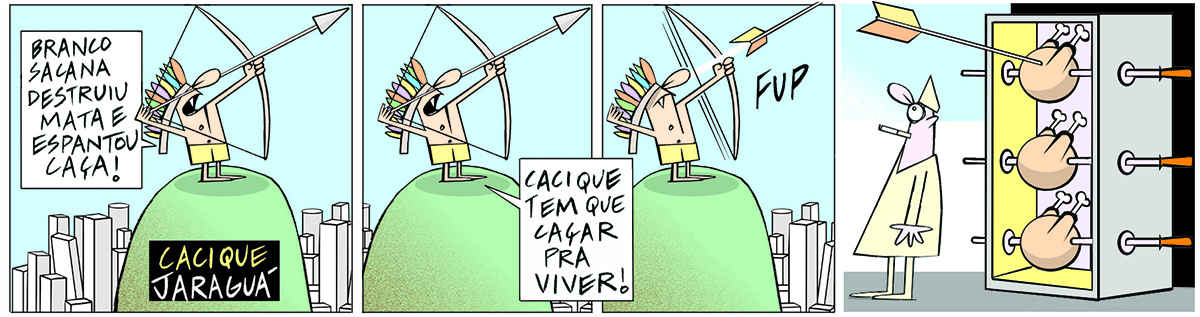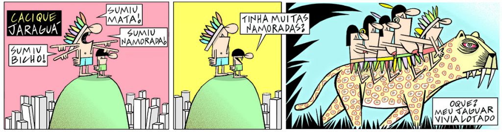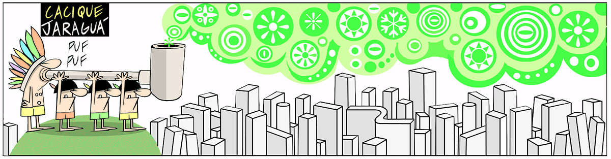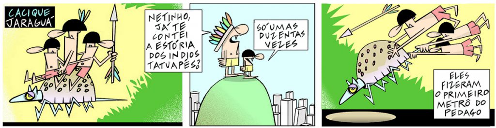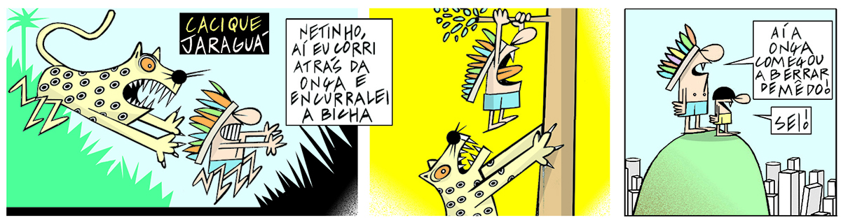 Do alto do Pico do Jaraguá, lá do ponto mais elevado da capital paulista, o Cacique Jaraguá vê a turbulenta cidade que se estende à sua volta. As coisas já não são como antigamente; agora a selva é de pedras, não há mais bichos selvagens pelas redondezas… Na companhia de seus incrédulos netinhos, o velho índio rememora os seus dias de glória, quando termos como Tatuapé, Pacaembu e Morumbi ainda eram usados para fazer menção a grandes tribos ou chefes indígenas – e não a bairros, avenidas ou estádios de futebol.