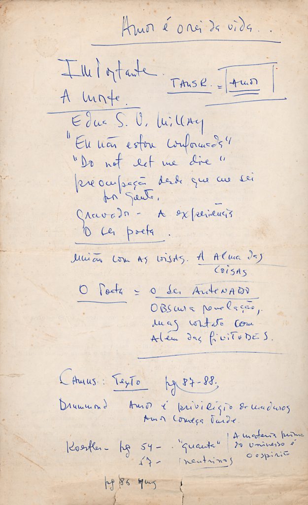Referências aos poetas Edna St. Vincent Millay e Carlos Drummond de Andrade, ao filósofo Albert Camus e ao jornalista Arthur Koestler | imagem: Instituto Hilda Hilst