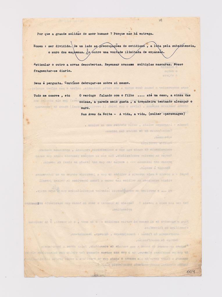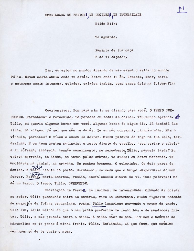 Na 22ª edição do programa Ocupação, centrado em personagens fundamentais da arte brasileira, a escritora Hilda Hilst (1930-2004) fala em primeira pessoa. De 28 de fevereiro a 21 de abril, no Itaú Cultural, em São Paulo, a mostra destaca as referências artísticas reelaboradas por ela, acompanha seu cotidiano – por meio de notas nas agendas, registros de sonhos, desenhos, reflexões – e delineia seu método criativo, pelas versões anteriores de suas criações literárias: seu trabalho “sendo” feito.