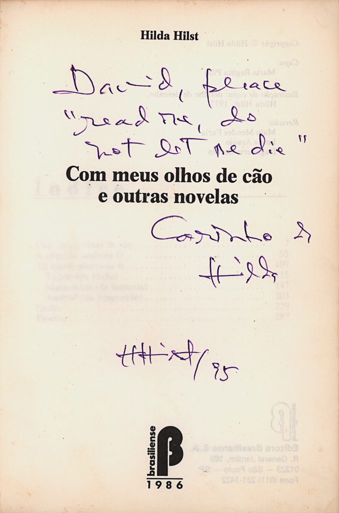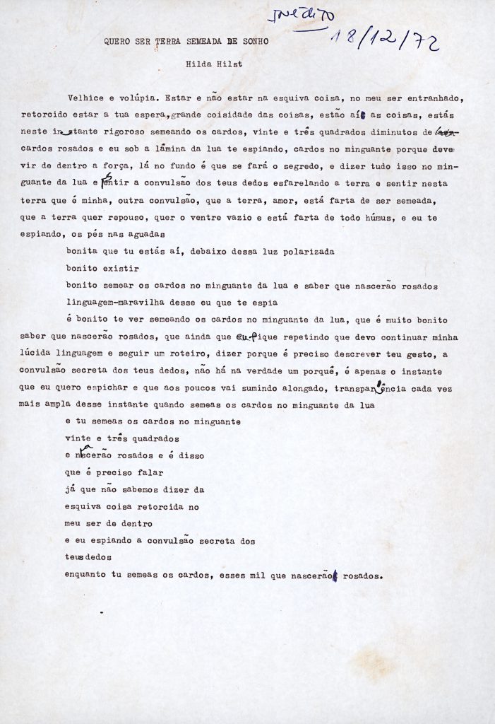 Hilda Hilst (1930-2004), ficcionista, poeta, dramaturga e cronista, publica Presságio, seu primeiro livro, em 1950, e inicia uma produção em poesia que se diz influenciada por Rainer Maria Rilke, escritor de língua alemã, e pelas obras quinhentistas nesse gênero. Nesse viés, seguem-se vários trabalhos hoje reunidos em Exercícios, antologia de 2002.