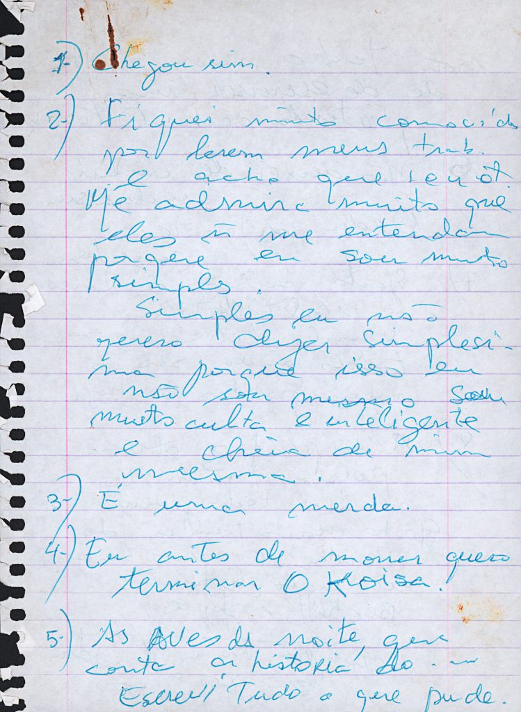 A mostra destaca as referências artísticas reelaboradas por ela, acompanha seu cotidiano – por meio de notas nas agendas, registros de sonhos, desenhos, reflexões – e delineia seu método criativo, pelas versões anteriores de suas criações literárias: seu trabalho “sendo” feito.