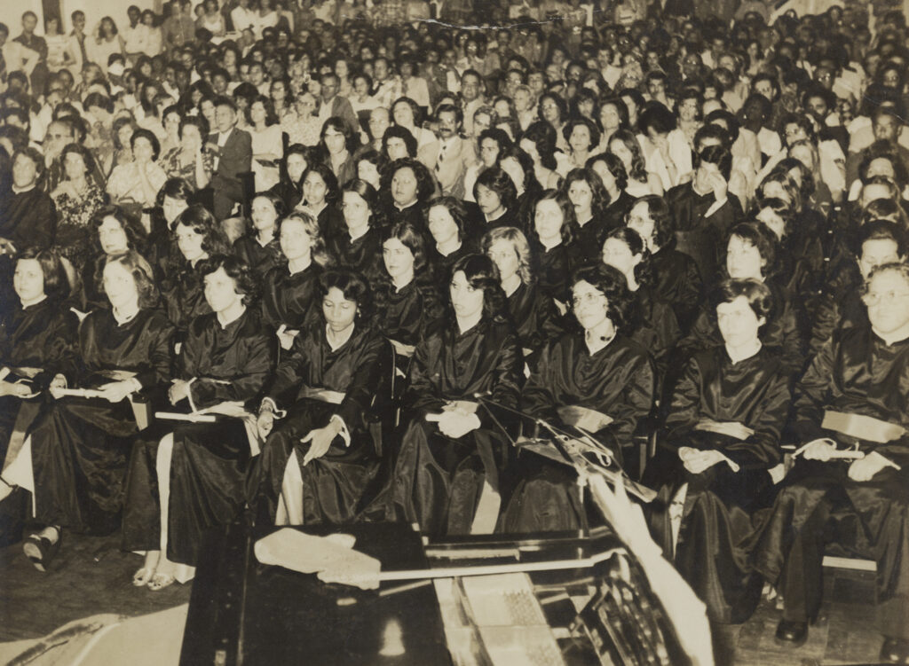 Formatura de graduação de Leda em letras, pela Universidade Federal de Minas Gerais (UFMG), em 1977. Da esquerda para a direita, ela é a quarta pessoa da primeira fileira | Acervo pessoal