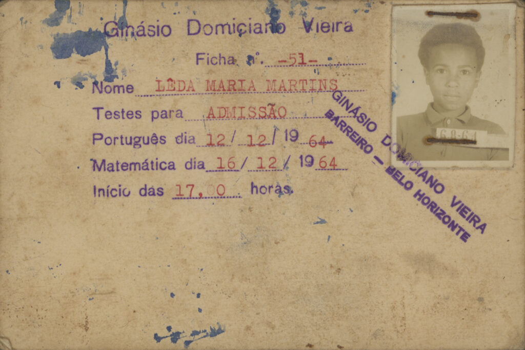 Ficha de testes para a admissão de Leda Maria Martins no Ginásio Domiciano Vieira, no bairro Barreiro, em Belo Horizonte (MG), em meados de 1960