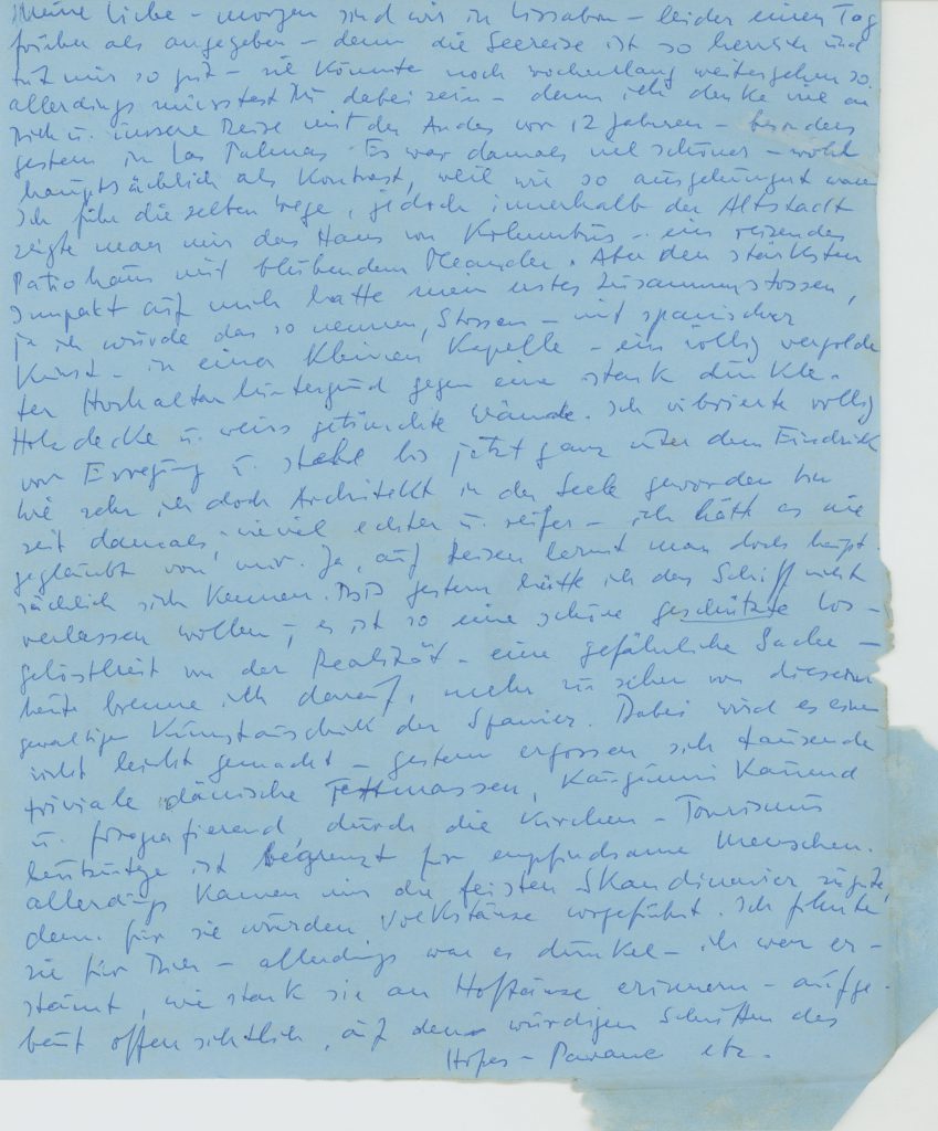 Minha querida: amanhã estaremos em Lisboa – infelizmente um dia antes da data informada, pois a viagem marítima é tão maravilhosa e me faz tão bem; ela poderia se estender ainda por meses, no entanto você teria de estar presente – penso muito em você e em nossa viagem com o navio Andes há 12 anos –, sobretudo ontem em Las Palmas. Naquele tempo era bem mais prazeroso, e penso isso particularmente como comparação, visto que éramos ansiosos, cheios de expectativas. Eu sinto os mesmos ensejos, no entanto fiquei impressionado quando me mostraram, no centro da antiga cidade, a Casa de Colombo – uma residência encantadora com pátio amplo e aloendros em flor. Mas o maior impacto que senti, o primeiro choque – sim, eu o chamaria assim – foi quando me deparei com a arte espanhola, em uma pequena capela, ao fundo, um altar-mor inteiramente dourado contra um teto de madeira profundamente escuro e paredes brancas caiadas. Isso me fez estremecer de exaltação. Vivo sob a impressão de como no decorrer do tempo me tornei arquiteto no âmago, me tornei mais verdadeiro e amadurecido – nunca acreditei que fosse capaz. Sim, é sobretudo viajando que se aprende a se conhecer verdadeiramente. Até ontem não queria deixar o navio – há um admirável desprendimento que protege da realidade, uma coisa perigosa –, hoje desejo com ardor ver mais desse monumental fragmento da arte espanhola. Nesse sentido, isso se tornou mais fácil – ontem se espalharam milhares de dinamarqueses, mastigando chicletes e fotografando em igrejas –; o turismo hoje em dia tem suas limitações para pessoas sensíveis. No entanto, fala a favor dos corpulentos escandinavos, aos quais foram apresentadas danças folclóricas. Eu as filmei para você – aliás, no escuro. Eu me surpreendi com quanto elas lembravam as danças da corte naturalmente pelos passos nobres – por exemplo, a dança pavana.