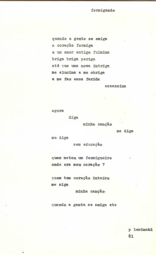 Reprodução de original datilografado da letra inédita Formigando, de Paulo Leminski | imagem: arquivo da família Leminski