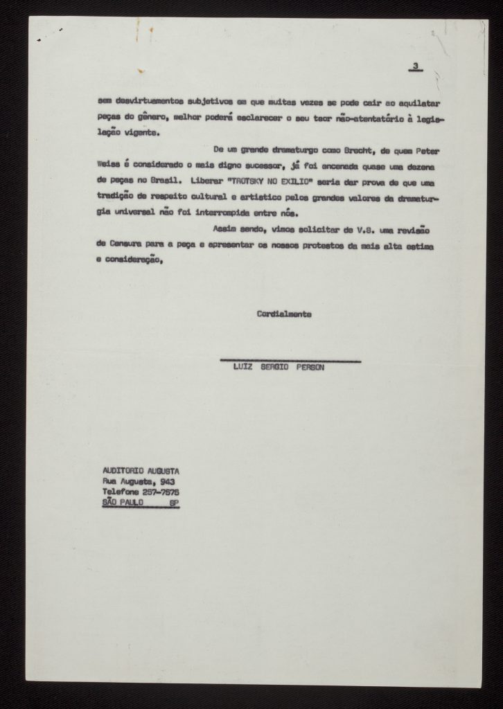 “Person morava no sítio, mas passava alguns dias da semana em São Paulo, cuidando do Auditório Augusta, teatro onde as peças que dirigia eram apresentadas com muito sucesso. Uma noite, Regina ligou aflita: o marido não tinha voltado para o sítio nem era encontrado em São Paulo. Mara e Regina procuraram por ele em toda parte; foram a hospitais, delegacias e até ao Instituto Médico Legal. Só o encontrariam dias mais tarde, no Hospital das Clínicas, internado como indigente. Havia acabado de morrer. Person não costumava andar com documentos. Bebeu, pegou carona com um sujeito que tinha acabado de conhecer num bar e sofreu o acidente na Régis Bittencourt (BR-116), a caminho de Itapecerica. A peça, que terminei de escrever sozinho, nunca seria encenada”.