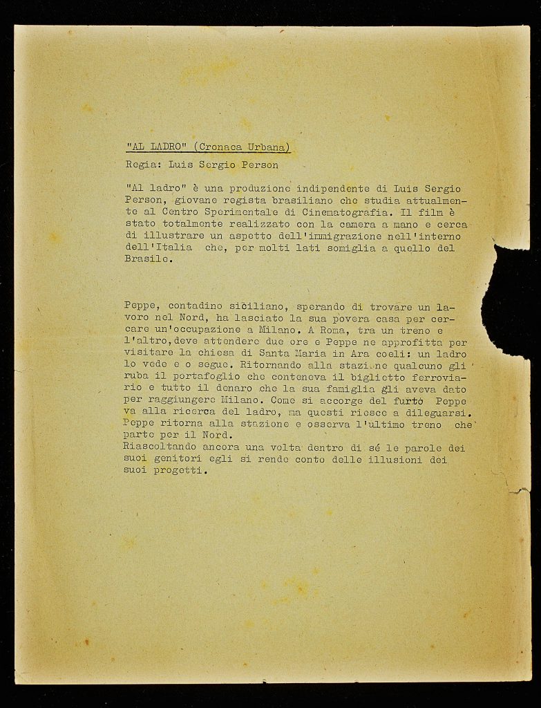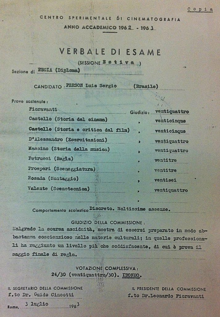 De 1961 a 1963, Luiz Sergio Person estudou no Centro Sperimentale di Cinematografia (CSC), em Roma, na Itália. Lá ele se tornou assistente de Luigi Zampa e chegou a realizar alguns curtas, com destaque para Al Ladro (1962). A paixão pelo neorrealismo do cinema italiano explica facilmente a escolha deste país para buscar um conhecimento técnico mais formal.