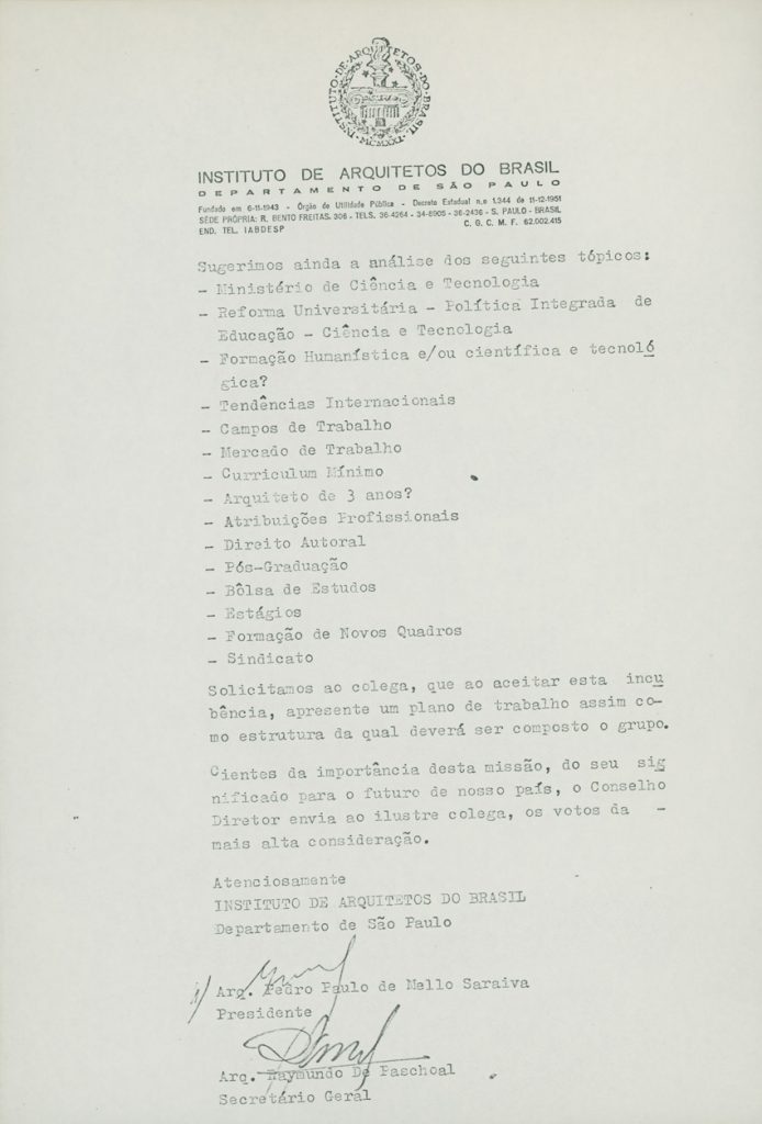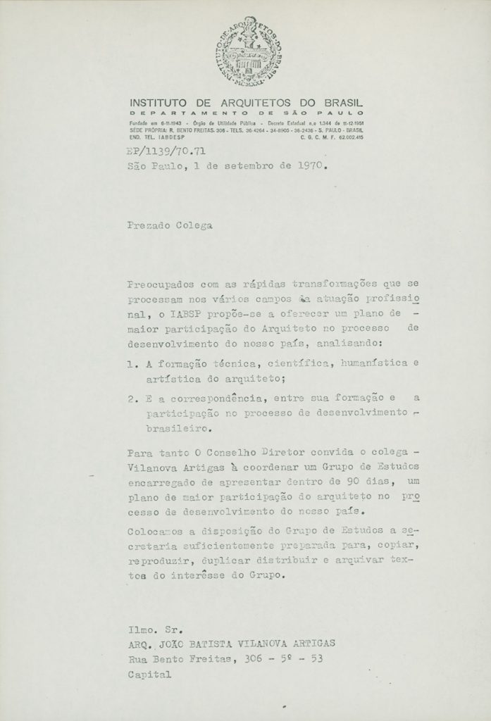 Convite do Instituto de Arquitetos do Brasil (IAB) para coordenação de um grupo de estudos | Imagem: Acervo da Família Artigas