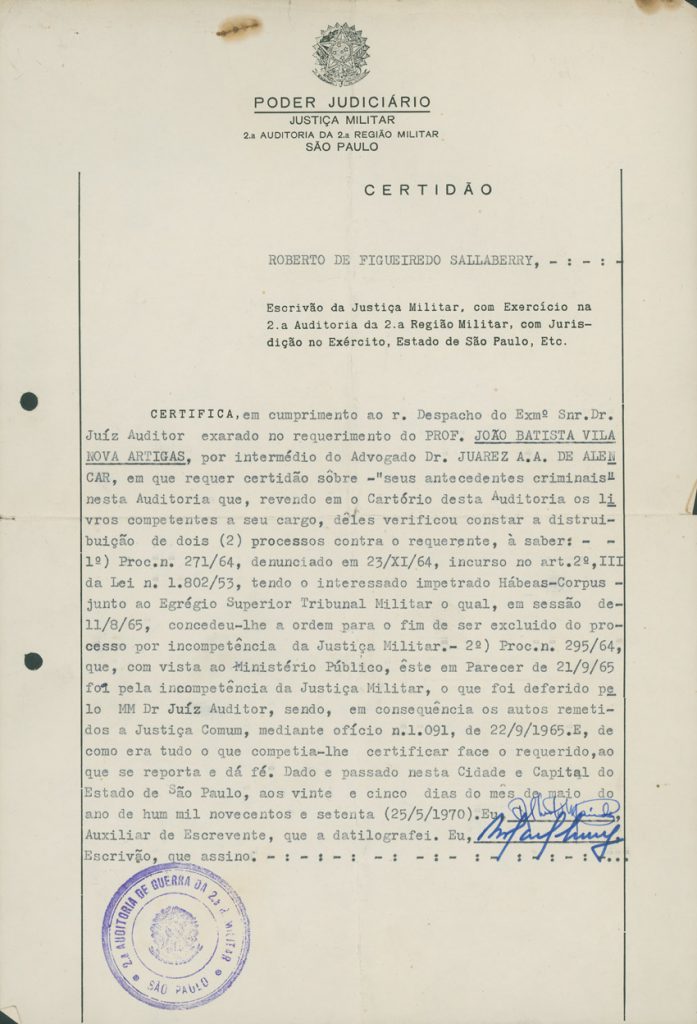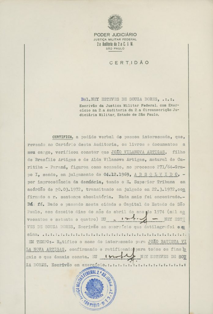 Registro do processo ao qual Artigas foi submetido pela ditadura civil-militar | Imagem: Acervo da Família Artigas