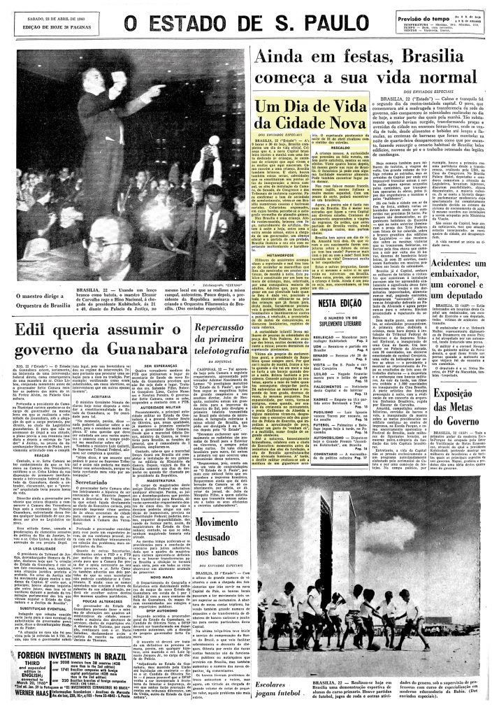BRASÍLIA, 22 (“Estado”)— Ás 9 horas e 30 de hoje, Brasilia completou um dia de vida oficial. Criança que é, a nova Capital brasileira iniciou uma manhã com uma festa dedicada ás crianças, ás centenas de crianças que aqui vivem e ás muitas que aqui nasceram. Como convém a uma criança, Brasilia também brincou, E claro, houve também coisas serias, solenidades que se constituiram nos pontos altos da inauguração: a missa campal, os atos de instalação da Camara, do Senado, do Congresso e dos Tribunais de instancia superior. Para confirmar o tom de seriedade do acontecimento, vêem-se em Brasilia numerosas casacas e lustrosas cartolas. Colarinhos engomados, em cujos bordos percebe-se o autografo vermelho do planalto goiano.