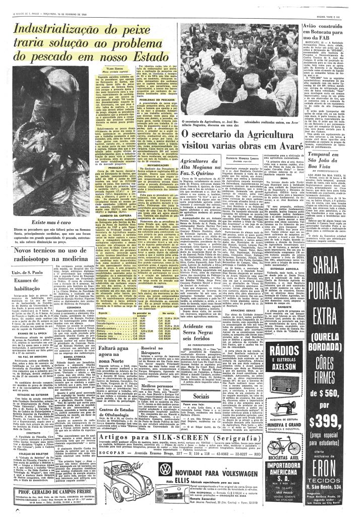 Segundo opiniões colhidas entre os pescadores que operam no Entreposto de Santos, não deveria haver falta de peixe por ocasião da Semana Santa, isto porque a presente época é das mais favoráveis para a captura, especialmente de sardinha, especime que em janeiro do ano passado atingiu 700 toneladas desembarcadas naquele local. Entretanto, em que pese o alto índice de captura, o pescado não deverá sofrer redução do preço. Alegam os pescadores e armadores que a presente época é aproveitada para o ressarcimento dos prejuizos sofridos durante os meses pouco produtivos.