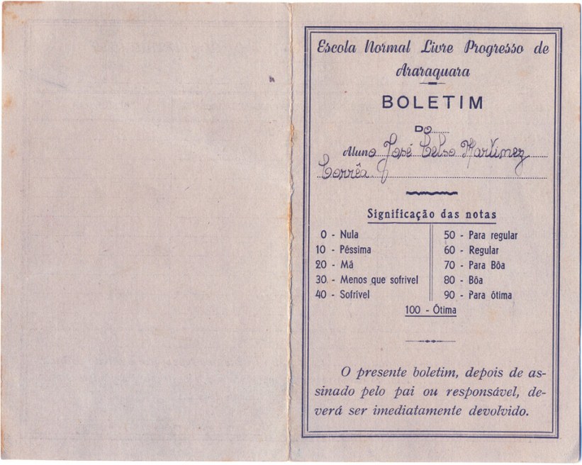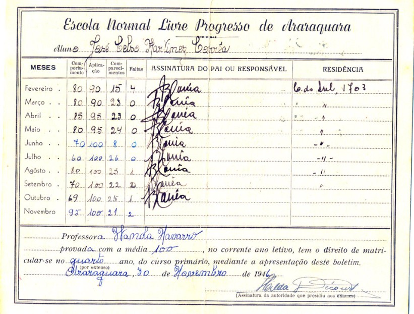 Boletim escolar de Zé Celso, à época no terceiro ano