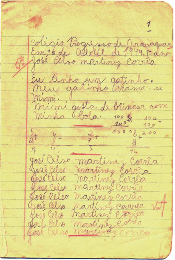 Anotações do caderno de Zé Celso no primeiro ano escolar