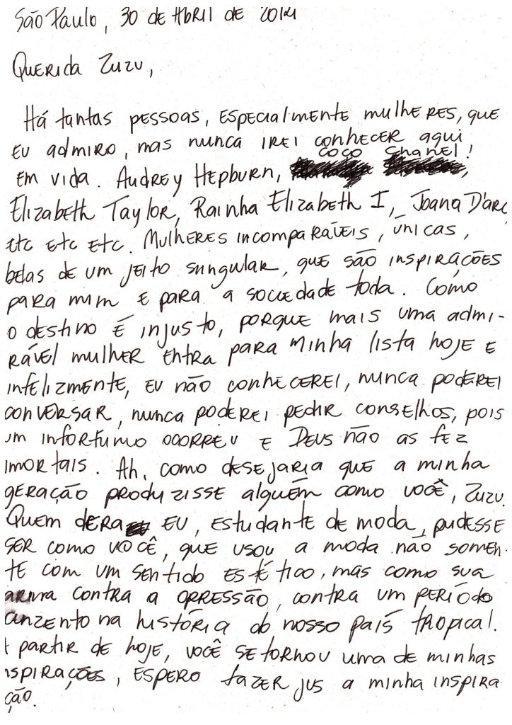 Escrever e costurar são coisas um tanto parecidas. Quem redige uma carta, cerzindo palavras umas às outras, está de certa forma bordando ideias e mensagens no papel. E a estilista Zuzu Angel, homenageada da 17ª edição do programa Ocupação Itaú Cultural, fazia muito dessas duas coisas: enquanto alargava as fronteiras da moda brasileira e se comunicava com o mundo por meio do tecido, da linha e da agulha, ela lançou mão incansavelmente do papel, da tinta e da caneta, ou da máquina de escrever, para entrar em contato com políticos, chefes de estado e outras pessoas que pudessem ajudá-la a encontrar seu filho Stuart, torturado e morto pelos oficiais da ditadura militar.