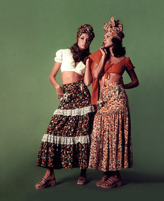“Os anos 70 começaram trazendo toda a referencia da moda hippie que começara ainda na segunda metade dos 60. Portanto, todo aquele visual característico desses jovens como calça boca-de-sino, multi-estampas, cabelos, longos, batas indians etc., ainda estavam em vigência na moda dos primeiros anos da década de 70. Os negros, por sua vez, usavam o penteado black power, super difundido pela militante norte-americana Angela Davis, a partir de 1971, contra o racismo nos Estados Unidos.” (…) “O que foi muito usado, contudo, foram as calças compridas jeans que variaram desde bocas-de-sino no início do decênio, passando por cortes mais tradicionais e chegando no final da mesma década ao corte baggy e ao semi-baggy.”