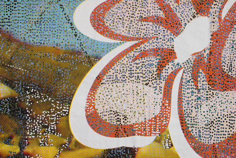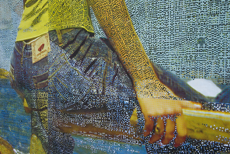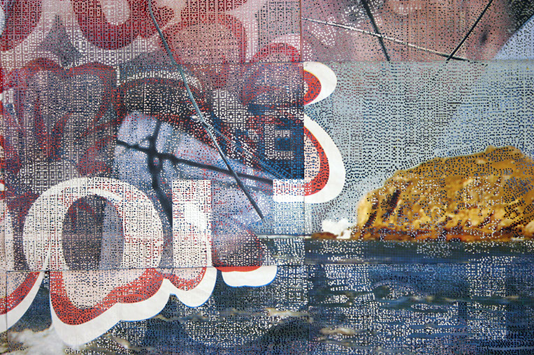 O artista Daniel Escobar costuma usar como matéria-prima objetos ligados ao mundo do desejo e do consumo. Nesta obra, ele se apropria do outdoor, peça publicitária urbana por excelência, sobrepondo quatro camadas e construindo uma “pintura” ao somar à retícula gigantografada uma nova retícula de pequenos furos, feitos um a um por um perfurador de papéis de escritório. O resultado das operações de desconstrução, acúmulo e deslocamento (o outdoor indoor) é uma imagem complexa, cuja relação metonímica com a cidade é evidente.