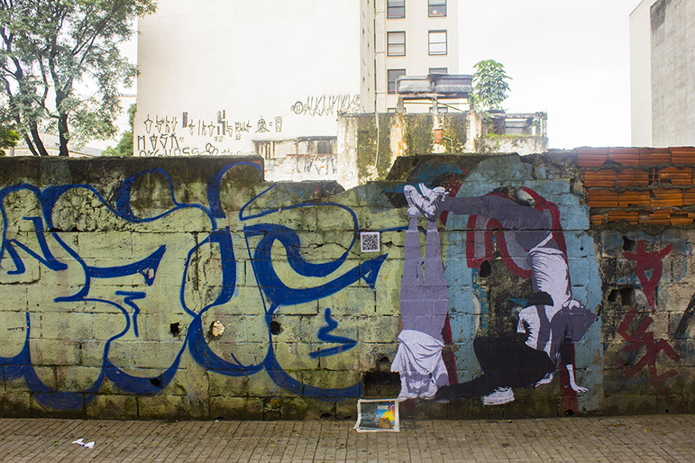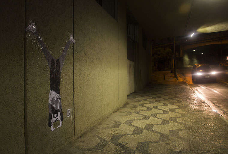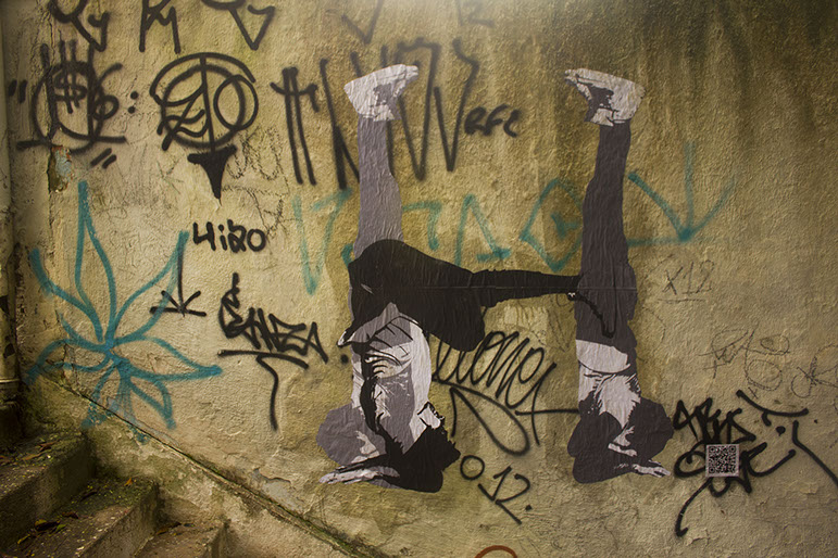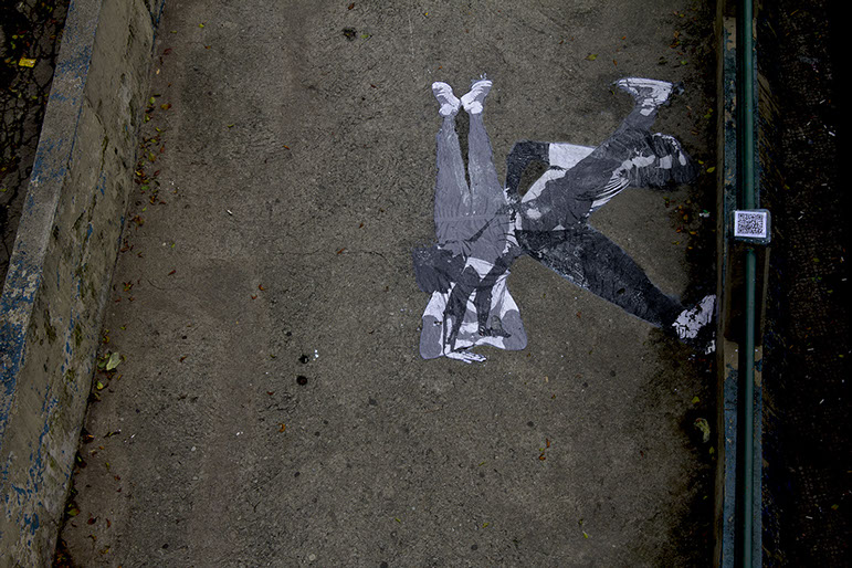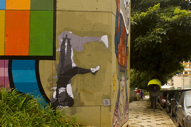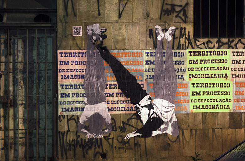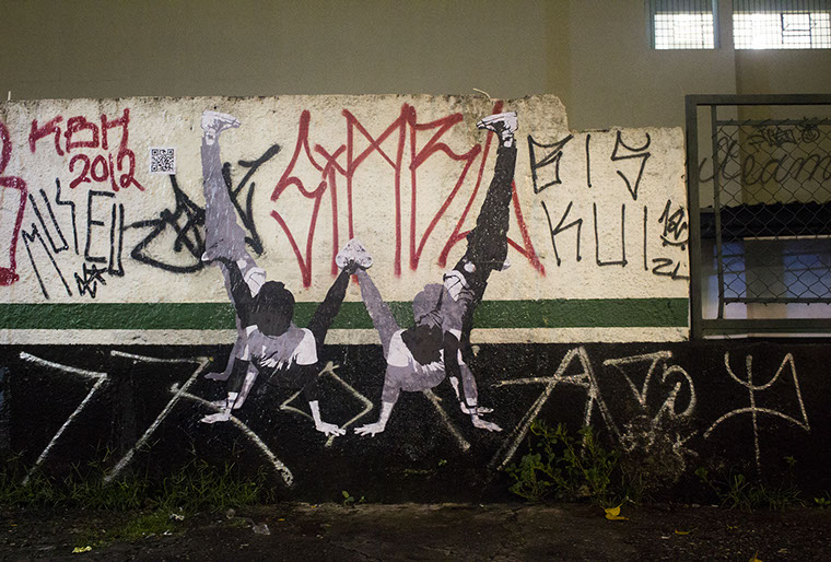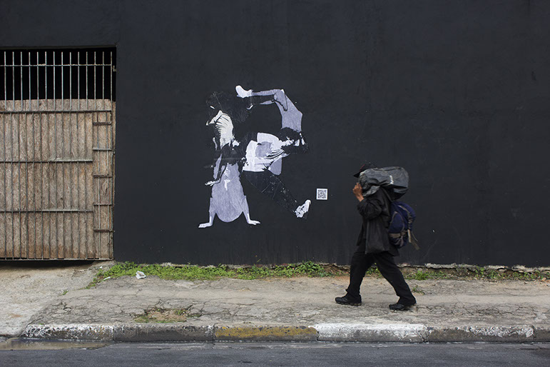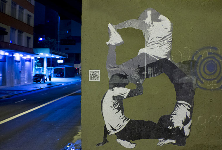 O break, estilo de dança que compõe a cultura hip-hop junto com o grafite e o rap, tem no cenário urbano o seu ambiente. Neste projeto, Caio Yuzo se apropria de movimentos característicos dessa manifestação artística para construir, em um vídeo, as 26 letras do alfabeto com o próprio corpo. Além do filme, o coletivo produziu lambe-lambes com as letras formadas pela coreografia. Colados no centro de São Paulo, os cartazes chamavam atenção para um QR code que levava para a página do vídeo na internet. Colaboraram: Georges Boris, Bruno Zaitsu, Lina Nagano e Susie Fugii.